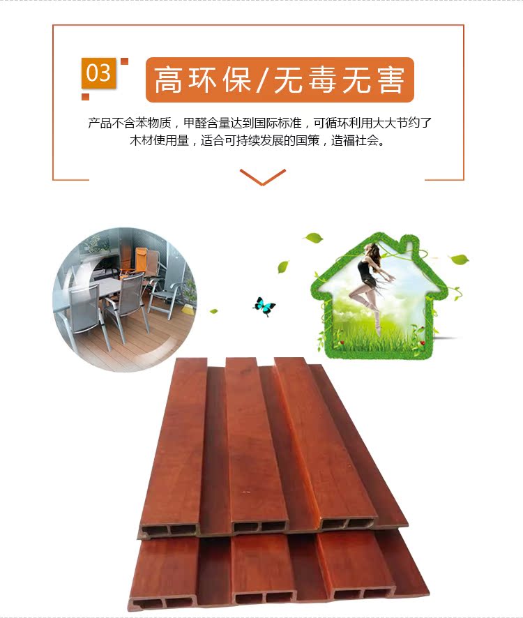 7.獨(dú)特性---產(chǎn)品是用木纖維同塑料混合加溫融合注塑而成的材料,不使用含有苯、甲醛、氰等有害物質(zhì)的材料,免除了裝修污染,無(wú)需維修與養(yǎng)護(hù)、無(wú)污染、無(wú)公害,并且具有吸引節(jié)能的特點(diǎn)。